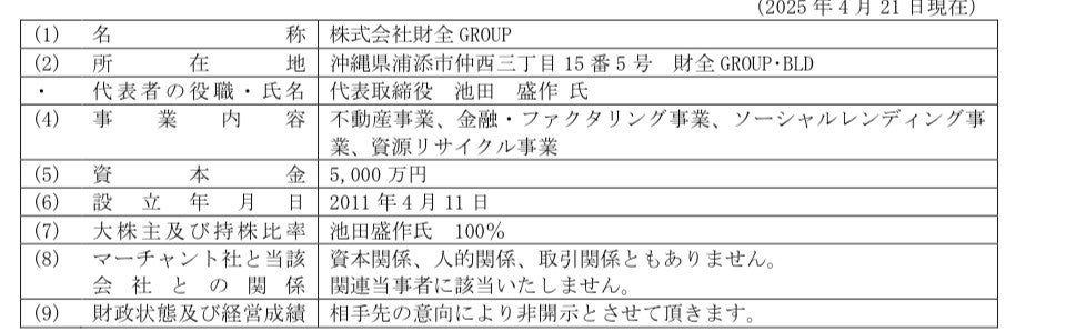 マーチャント・バンカーズ株式会社(以下、マーチャント社といいます。)は、2025 年1 月14 日付「株式担保融資事業取組み開始に関するお知らせ」でお知らせしました株式担保融資事業につきまして、株式会社財全GROUP並びに同グループ各社(以下、「財全GROUP社」といいます。)との業務提携を、2025 年4 月21 日付で取締役会決議し、業務提携契約を締結いたしましたので、
