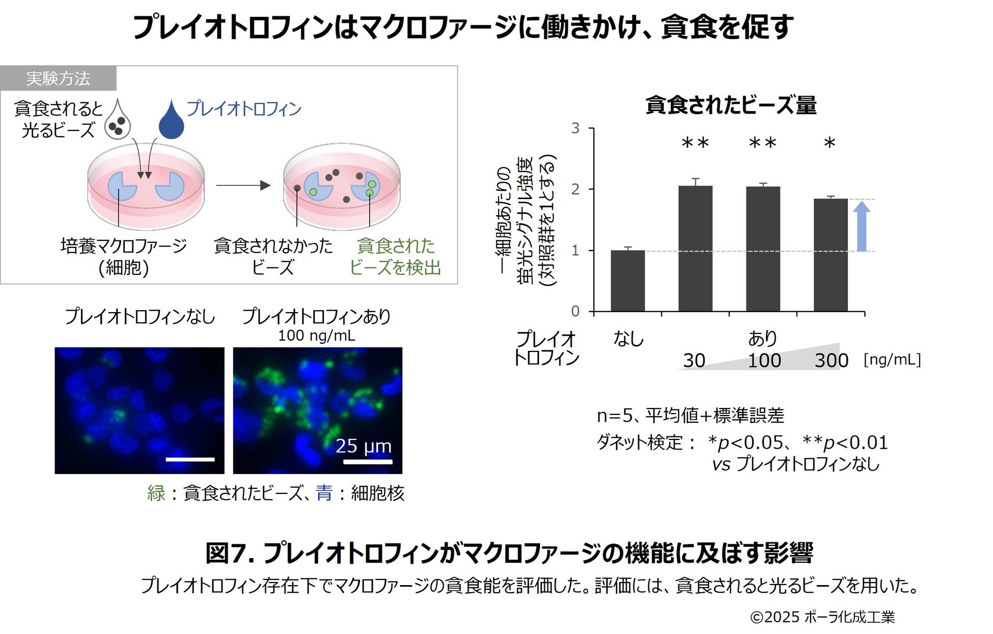 マクロファージに、異物としてビーズを与える実験を行ったところ、プレイオトロフィン存在下では、マクロファージに取り込まれたビーズの数が有意に増加し、貪食能が高まっていることが示されました(図7)。