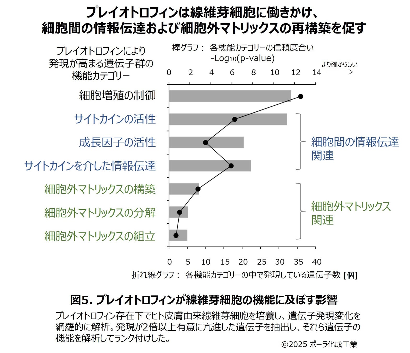 培養実験の結果、プレイオトロフィンの添加により、細胞間の情報伝達を担う分泌因子群の産生が高まることが分かりました。細胞外マトリックスの分解や構築を担う遺伝子群の発現も高まっていました(図5)。