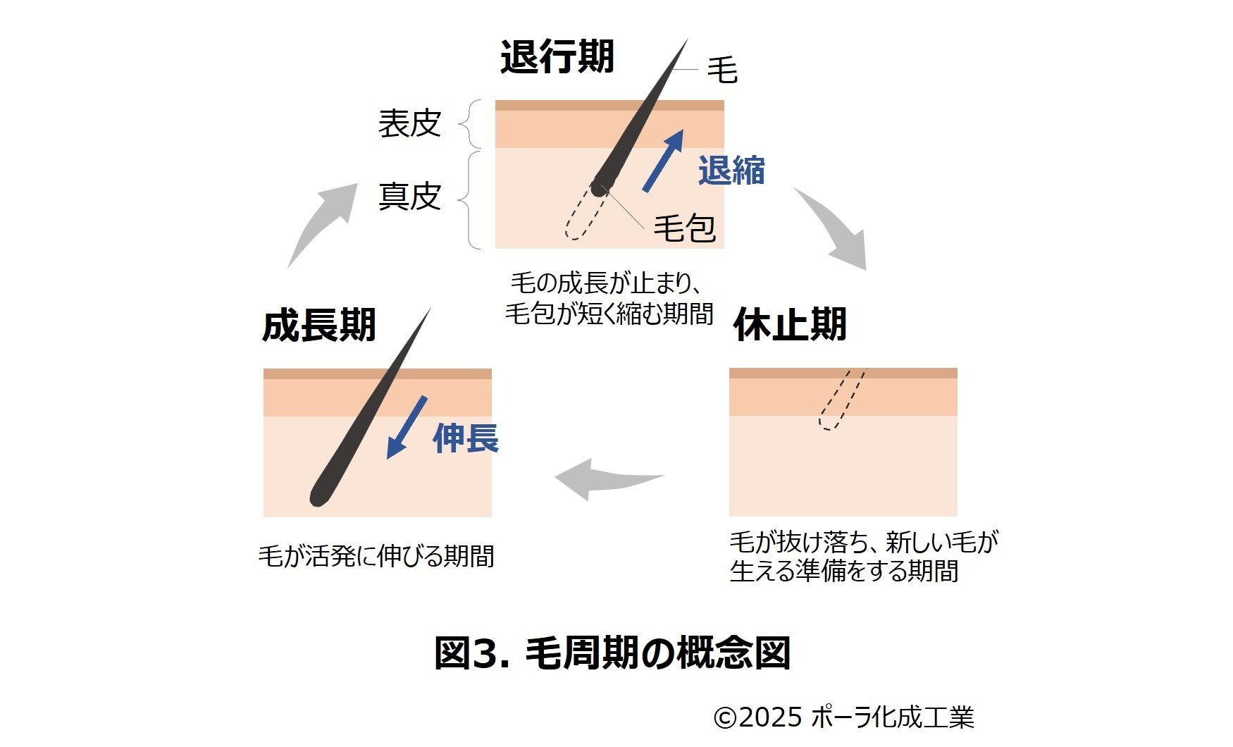 毛が成長し、抜け落ちるまでの一連のサイクルを毛周期と呼びます。このサイクルは主に、休止期、成長期、退行期という3つの段階に分かれています。毛の根元に存在する毛包は、成長期に真皮深部まで伸長し、退行期には短く縮みます(図3)。