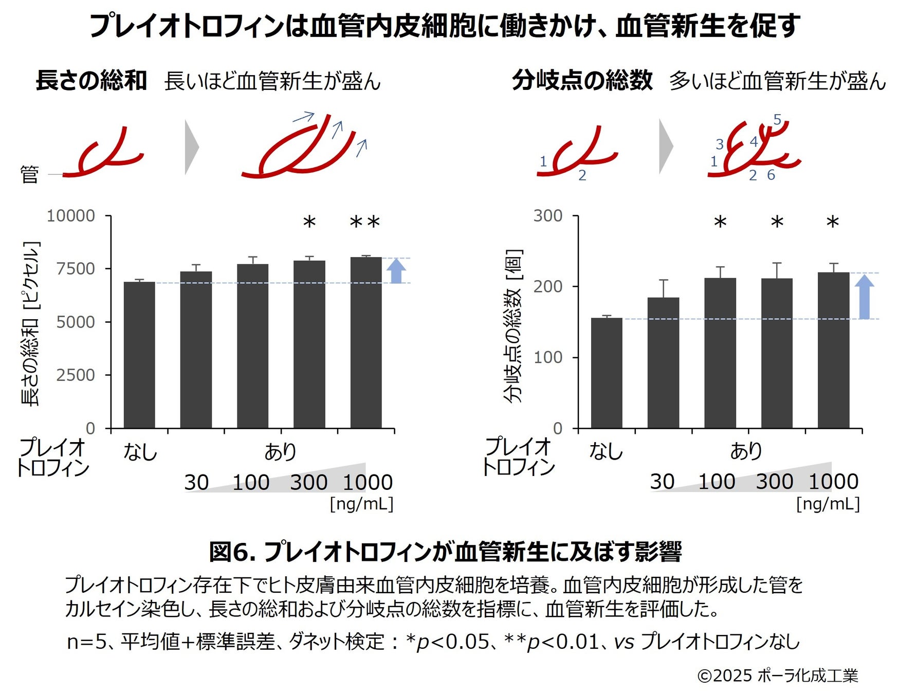 血管内皮細胞にプレイオトロフィンを添加すると、形成された管の長さの総和と、分岐点の総数が増加しました(図6)。これによりプレイオトロフィンが血管新生を促すことが示されました。