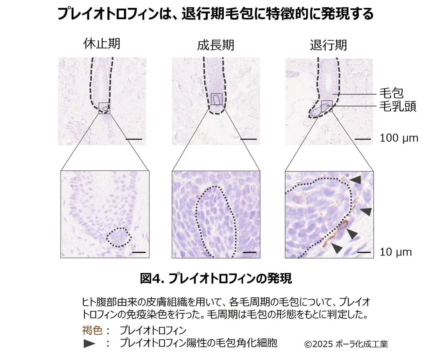 皮膚組織でプレイオトロフィンを染色してみると、毛の根元に存在する毛包角化細胞において、退行期になると発現することが分かりました(図4)。