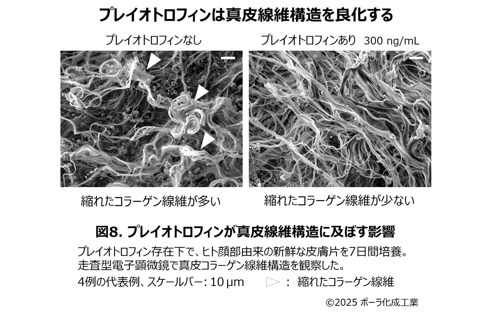 検証には、組織内の細胞が反応性を維持している新鮮な皮膚片を用いました。皮膚片をプレイオトロフィン存在下で7日間培養すると、縮れて質の低下した線維構造が減り、代わりにきめ細かい線維の新生が認められ線維密度も高くなっていました(図8)。