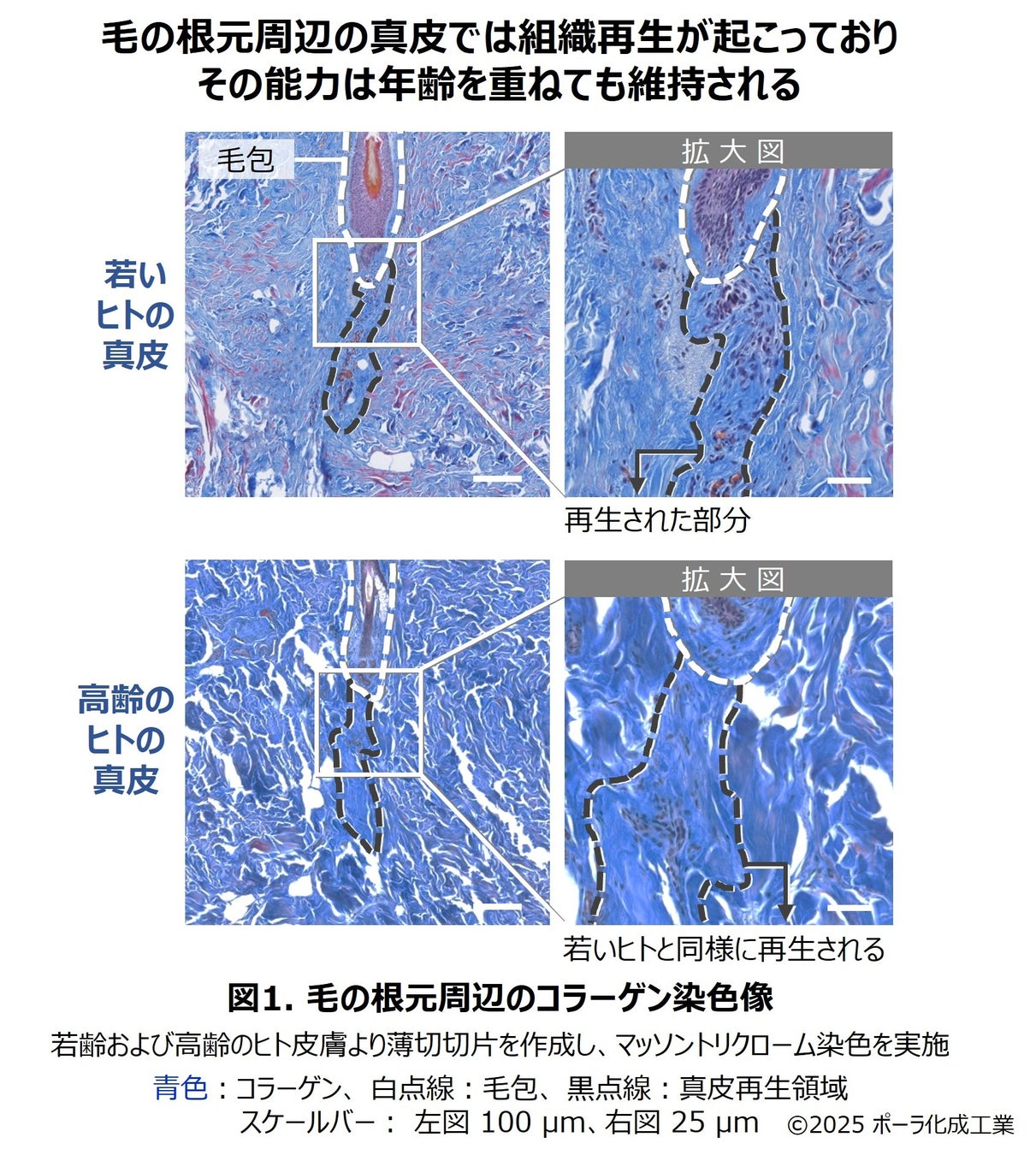 ポーラ・オルビスグループの研究・開発・生産を担うポーラ化成工業株式会社(本社:神奈川県横浜市、代表取締役社長:片桐崇行)は、毛の根元周辺では歳を重ねても真皮が再生されていたことに着目し、下記を見出しました。