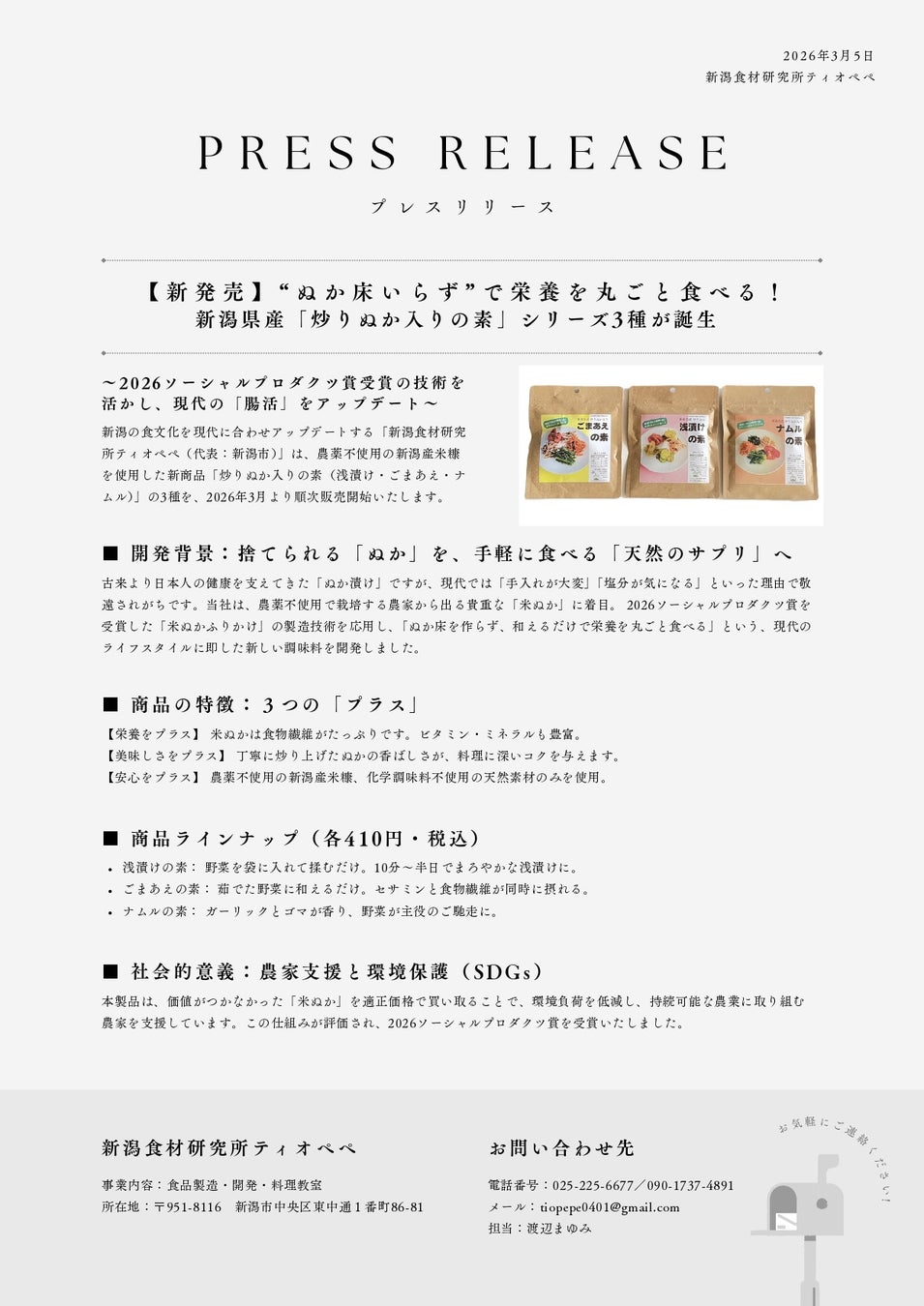 ・新潟食材研究所ティオペペ(新潟市):新潟県産炒りぬか入り浅漬けの素・ごまあえの素・ナムルの素