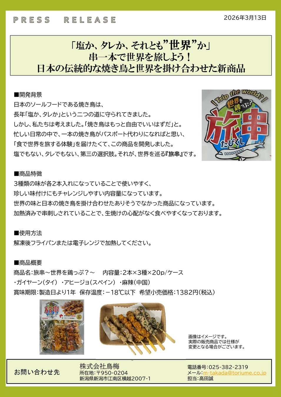 ・株式会社鳥梅(新潟市):旅串~世界を鶏っぷ?~(ガイヤーン・アヒージョ・麻辣)