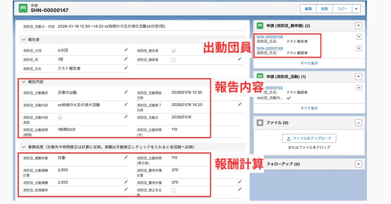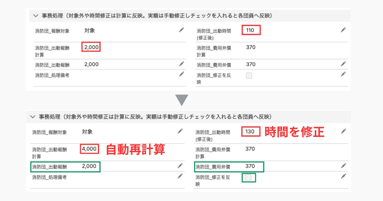 再計算結果を参考にしながら、緑枠の金額を修正し、「修正を反映」にチェックを入れて保存すると、出動した団員たちの報酬額に反映する仕組みです(下図緑枠)。