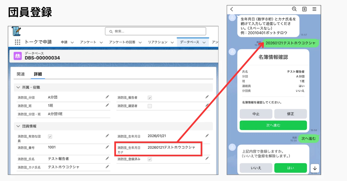 団員は、LINE上で生年月日とカナ氏名を入力して登録します。一般の方が登録してしまわないように、事前にインポートした団員情報と照合し、本人確認ができると登録が完了します。