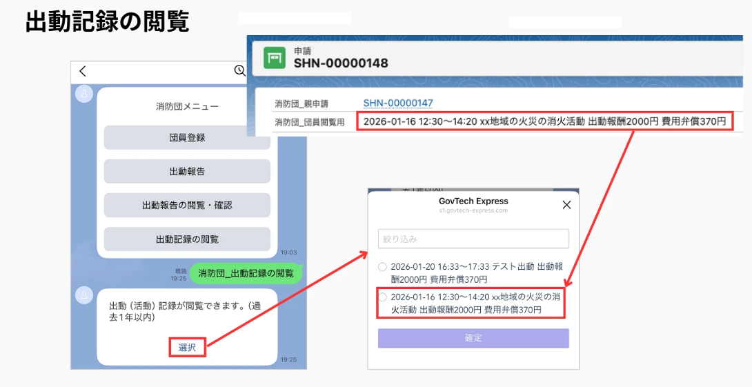 団員は、自身の出動記録をLINE上で確認します。標準では、日時、内容、報酬額が表示されます。