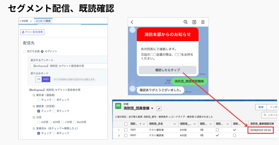 メッセージに既読確認用のボタンをつけると、団員登録と紐づいた既読状況が確認ができるので、「既読がつかなかった分団長には念のため電話する」といった運用も可能です。