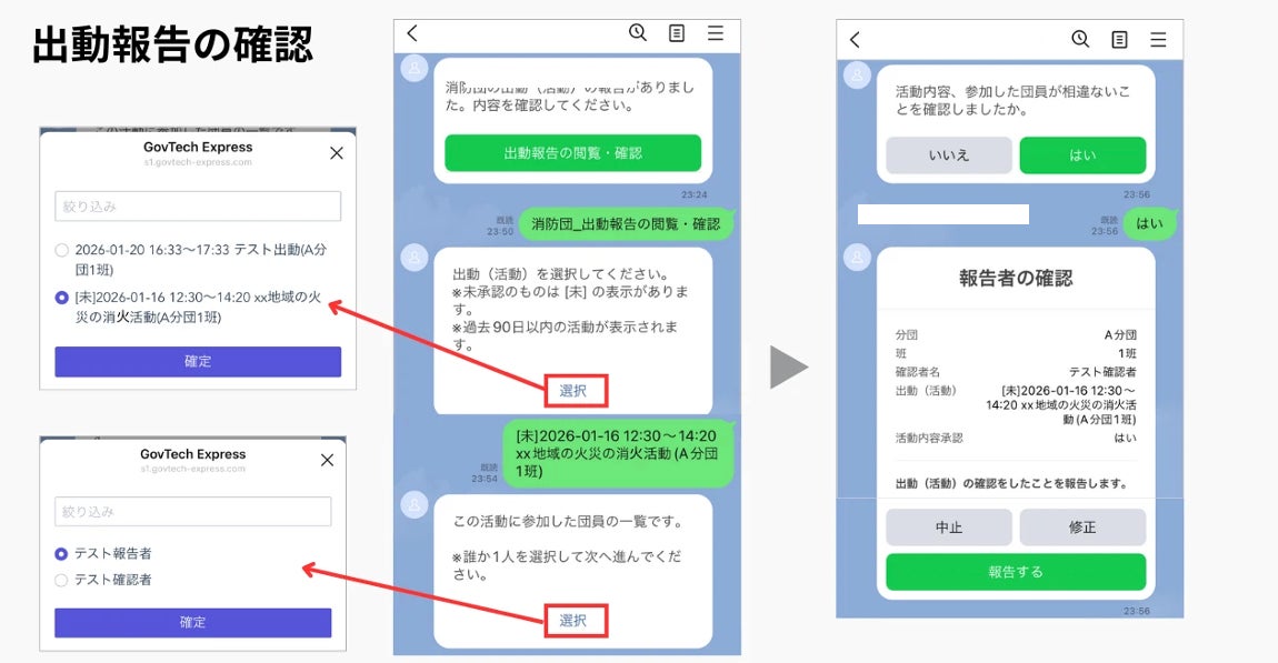 報告が送信されると、分団長(確認者)のLINE上にメッセージが自動で届きます。分団長は出動内容と出動した団員を確認し、LINE上で自治体に報告します。