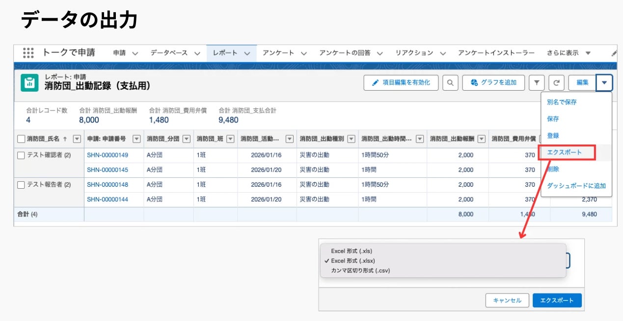 団員登録、出動報告などのデータは、すべてExcelやCSVとして出力が可能です(レポート機能)。