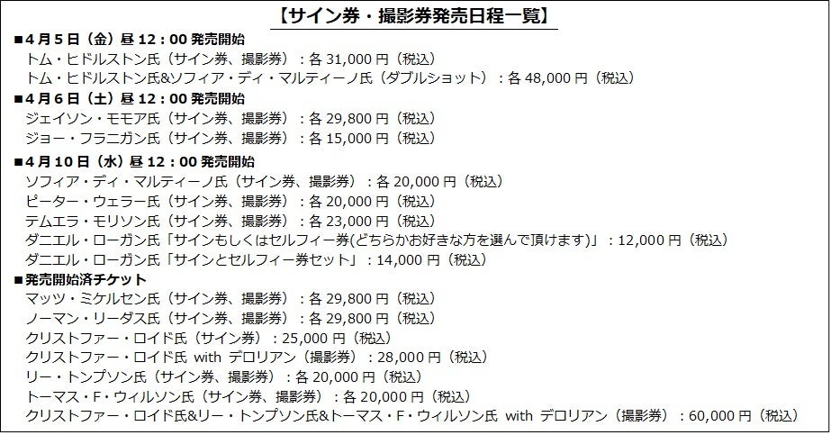 サイン券・撮影券はチケットぴあ及びハリコンサイトの両サイトにて、4月6日(土)昼12:00より発売開始となり、チケット料金はモモア氏のサイン券・撮影券が29,800円(税込)、フラニガン氏のサイン券・撮影券が15,000円(税込)となります。