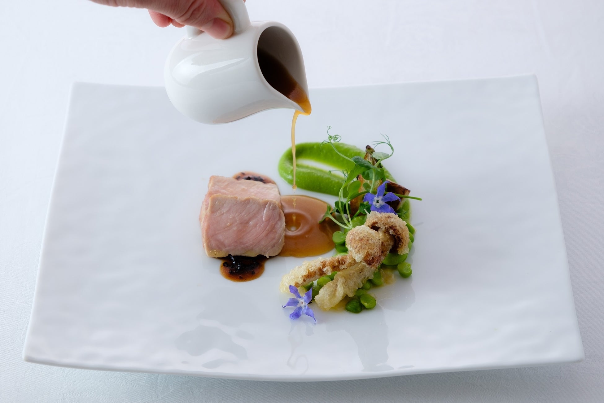 オランダ産の仔牛のロース肉を芳醇な黒トリュフのソースと牛肉の旨みを凝縮したジュソースで味わうメインディッシュ。鮮やかなグリーンピースのピューレ、蕾菜(つぼみな)のソテーや博多すぎ茸のフリットから春を感じます。