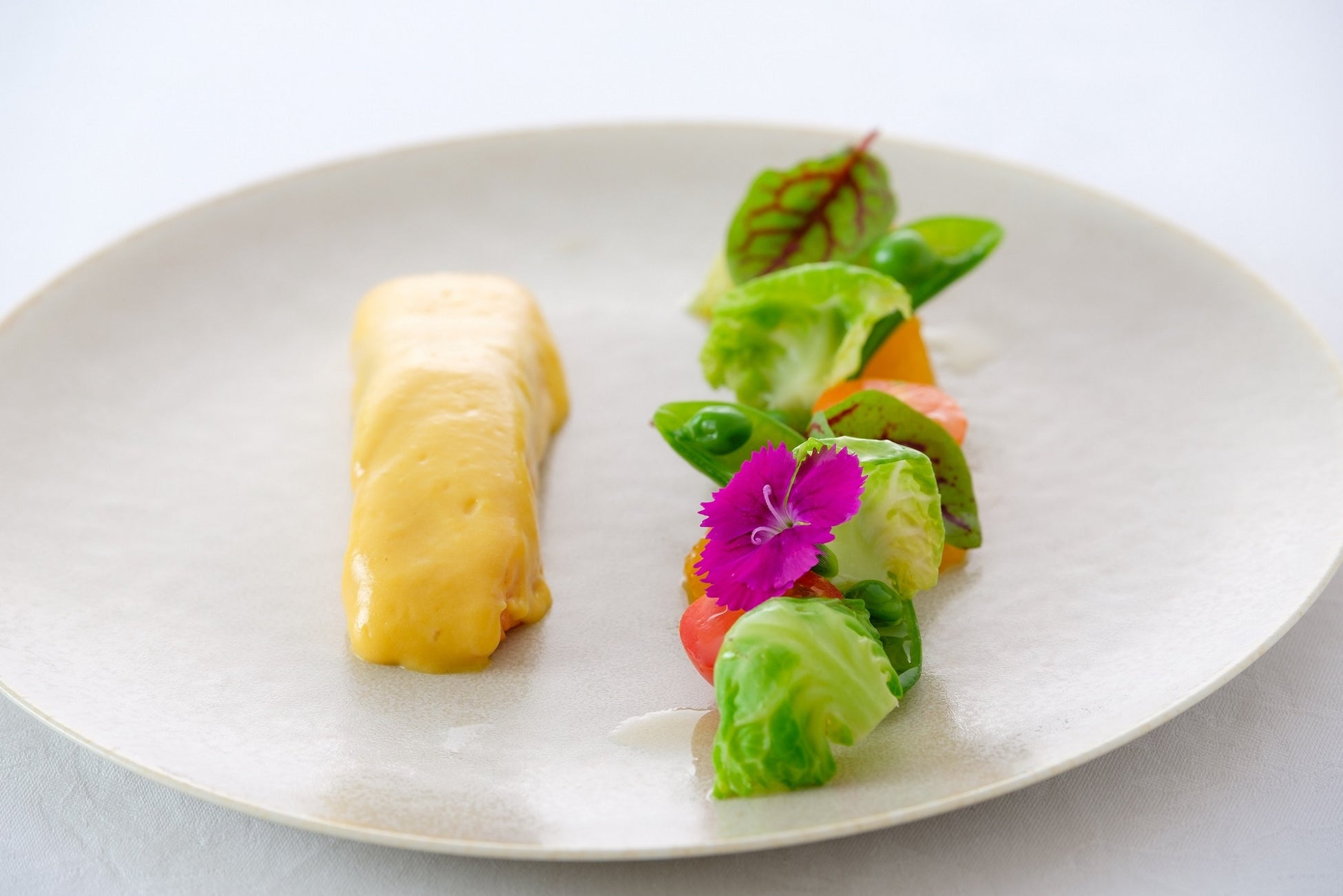 玄界灘産のサーモンを弱火でゆっくりと燻製にし、熊本県産デコポンや春キャベツなどの春野菜とともに美しいサラダ仕立てに。シャンパンの香るベアルネーズソース(酸味のあるフランス料理の伝統的なソース)とともにお召し上がりいただきます。上品なシャンパンの香りをまとった爽やかなソースが脂の乗ったサーモンの味わいをより豊かにします。
