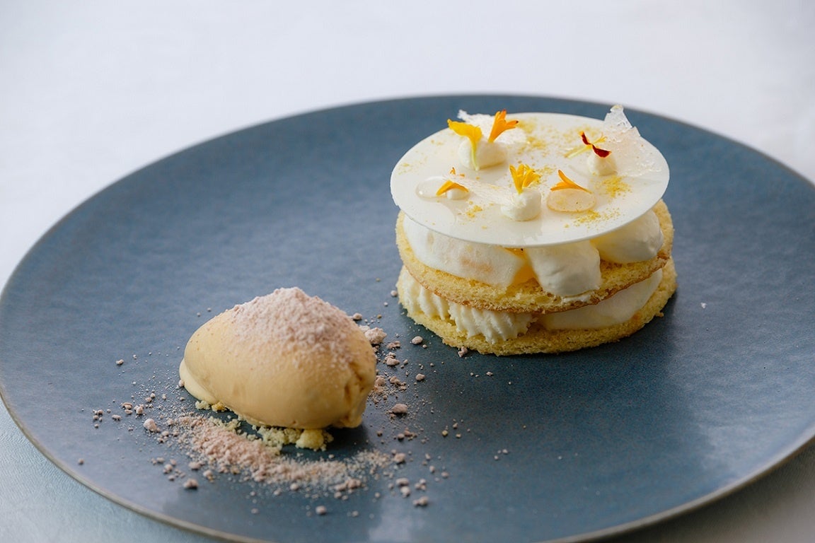 ホワイトチョコレートのクリームと日向夏を合わせた春らしい柑橘香るデザート。二層に重ねた生地の真ん中にのせた、自家製日向夏のソースが爽やかに全体を包み込みます。生姜風味のジェラートがアクセント。