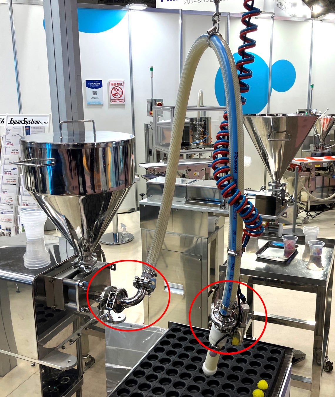 (株)ジャパンシステム様のブースでは、実際に生地やクリームなどを充填する充填機に取り付けた様子をご覧いただけます。