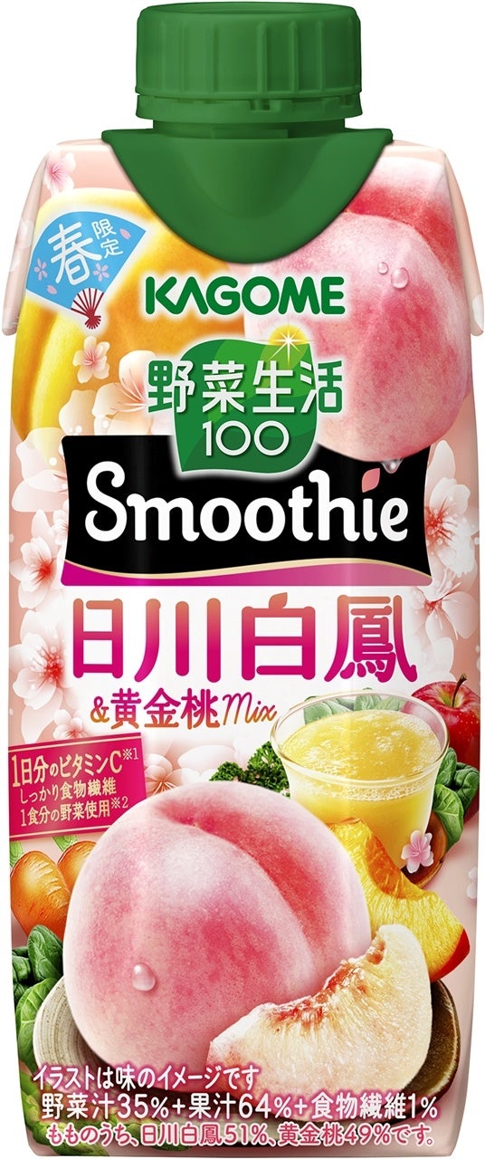 「野菜生活100 Smoothie 日川白鳳&黄金桃Mix」は、日川白鳳の香り豊かで上品な甘さと、黄金桃の芳醇な香りを感じる春限定の濃厚スムージーです。1食分の野菜(120g分)を使用※1し、しっかり食物繊維と1日分のビタミンC※2が摂れます。