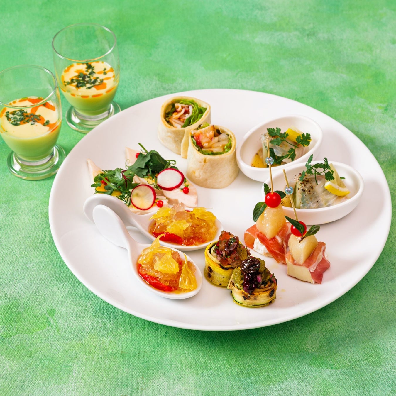 カマンベールチーズと生ハム巻き 桃のピンチョス、スズキのマリネと大葉のピーチヴィネグレット、ドライトマトと甘夏のコンポートゼリー、グリルズッキーニとハーブチーズロール ドライフルーツのサルサ、鶏ハムのスライス レフォールクリームとマンゴーソース、タコと野菜のピリ辛トルティーヤ巻き