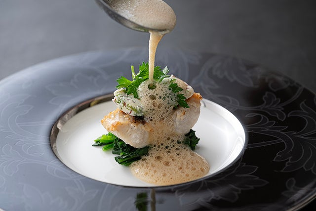 三河湾で獲れたスズキのポワレ 海藻と焦がしバターソース