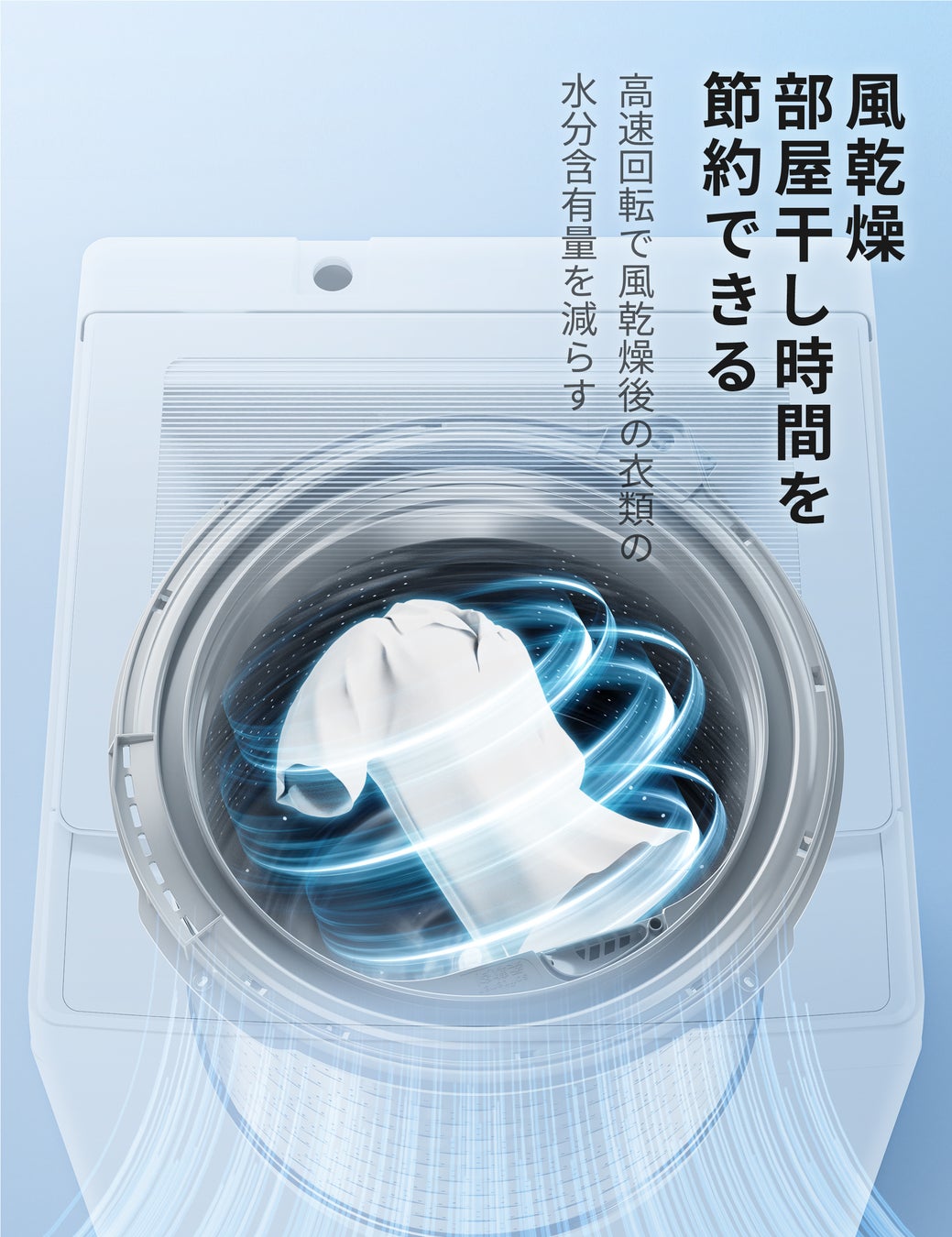 COMFEE' 洗濯機は、ヒーターを使わない風乾燥機能を搭載しています。この機能は、脱水槽の遠心力と通風口から取り込んだ空気を利用して衣類の水分を素早く除去し、部屋干しの乾燥時間を大幅に短縮します。また、ヒーターを使用しないため、エネルギー効率が高く、電気代の節約にもつながります。さらに、脱水槽の遠心力と通風口から取り込んだ空気で衣類を風通しの良い状態に保ちながら乾燥させるため、衣類の柔軟性や風合いを損なうことなく、清潔でフレッシュな仕上がりを実現します。