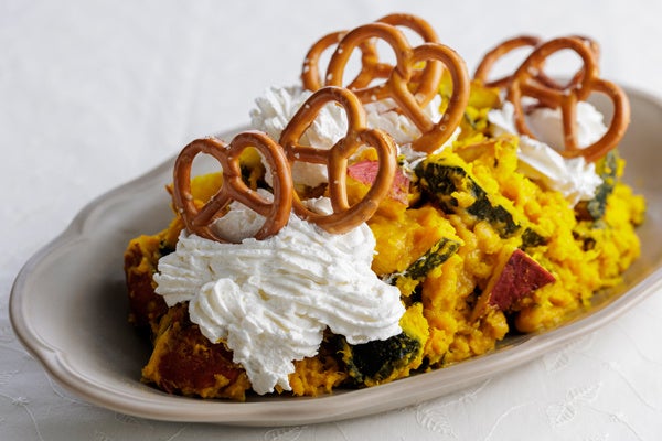 関西のサラダカフェ店舗では、過去に、さつまいものサラダにホイップクリーム、アーモンド、さつまいもチップスをトッピングした商品が人気を集め定番化。この商品にヒントを得て、立体感のある見た目が楽しめるサラダに仕上げました。コクと深みのある味わいにホイップクリームの甘さとプレッツェルの塩気がよく合い、食事の箸休めや、おやつ、デザートにおすすめです。ハロウィンの特別な一皿としてもお楽しみいただけます。