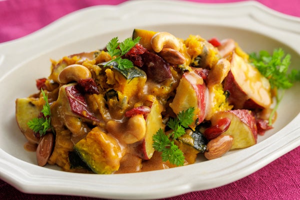 しっとりとした食感の“シルクスイート”とかぼちゃの甘味が引き立つ、風味豊かな味わいのデザートサラダです。キャラメリゼしたナッツがアクセント。甘さとほんのりとした苦さを感じられるソースが素材によく合います。