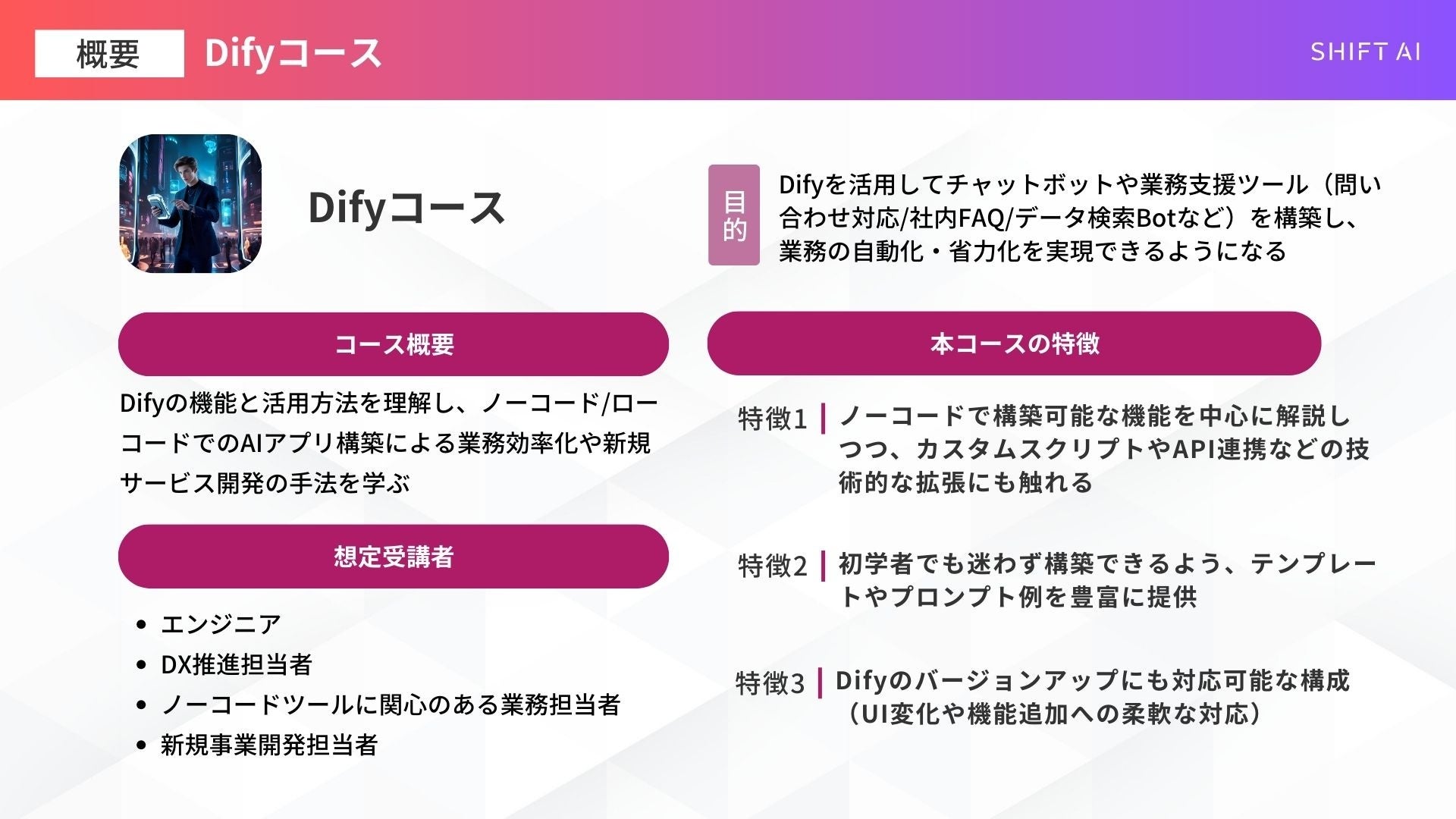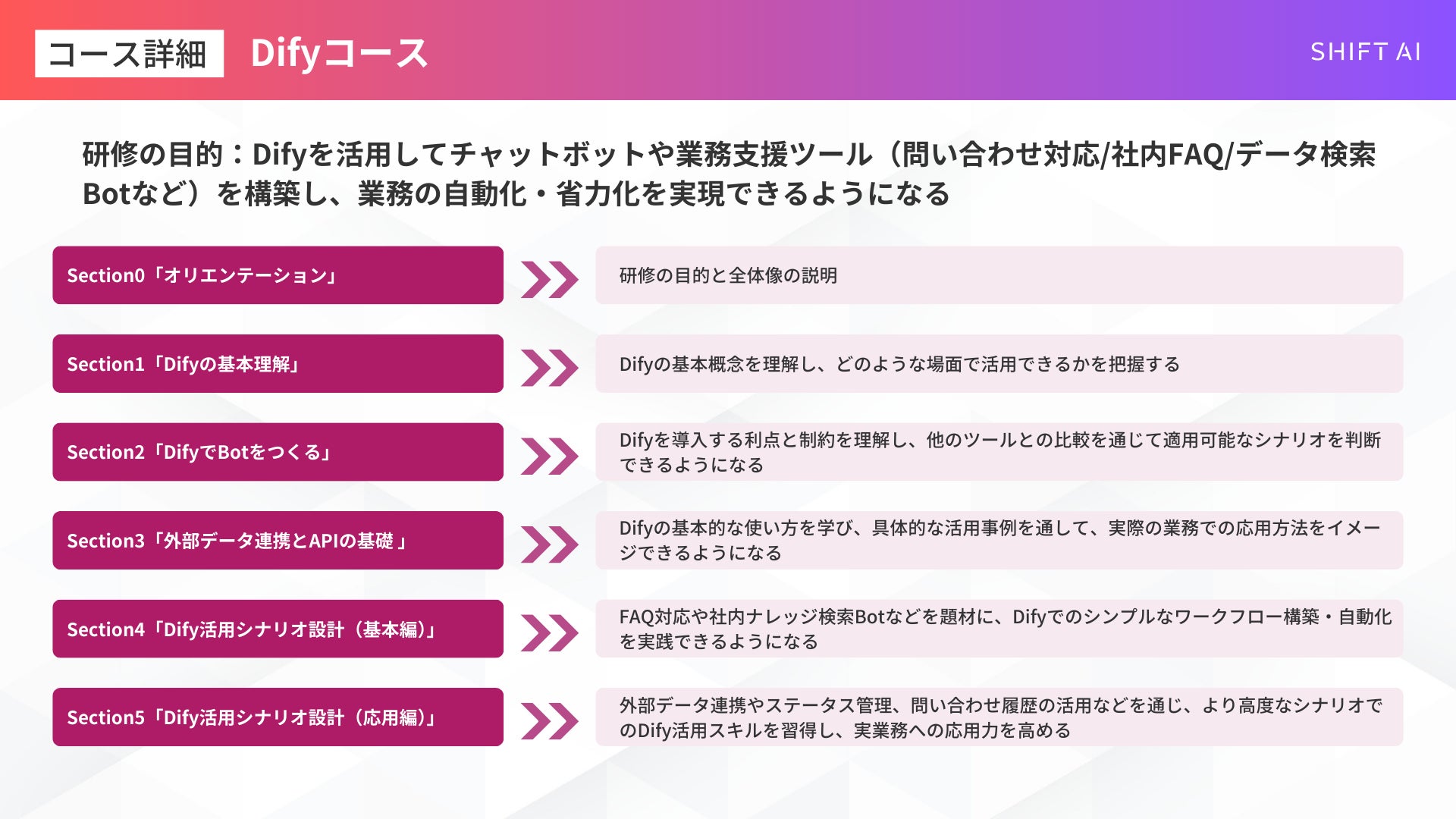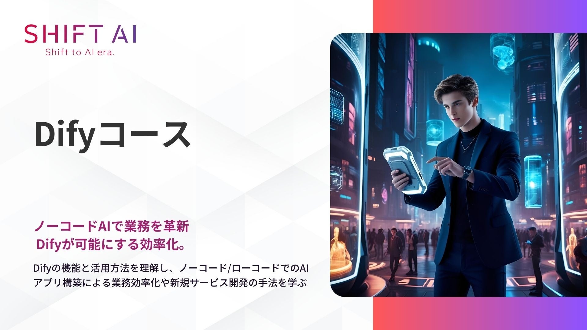 「日本をAI先進国に」を掲げAIのビジネス活用を学べる利用者数No.1※のAI大学「SHIFT AI」を運営する株式会社SHIFT AI(東京都渋谷区、代表取締役 木内翔大、以下 当社 )は、法人向け新サービス「Difyコース」を2025年5月29日より提供開始します。