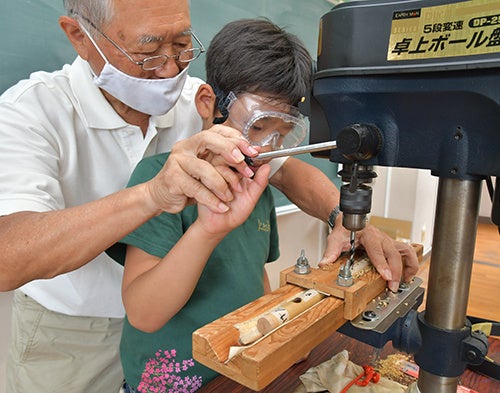 この日は井上さんと、毎年同校に出向き、児童に篠笛の作り方を伝えている岩瀬貞徳さんの指導を受けながら、篠笛作りに挑戦。子どもたちは、印をつけた篠竹に電動ドリルを使って唄口と指穴を開け、岩瀬さんに焼きごてで穴を滑らかにしてもらった後、井上さんから鳴らすコツを教えてもらい、苦戦しながら篠笛の試し吹きをしました。音が響くと、子どもたちからは「わー、鳴った鳴った」と歓声があがりました。今回製作した篠笛は、岩瀬さんが指穴の微調整をし、内側に漆を塗って仕上げ、9月下旬頃に完成予定。井上さんの指導で練習を重ね、校内演奏会や地域で披露される予定です。