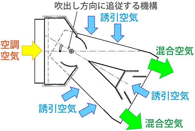 「in-DUCT」吹出口タイプは、誘引を生み出す「くぼみ」の前後の縮小部と拡大部を分割し、拡大部の回転が可能な機構を採用しています。これにより、誘引性能を確保しながら、最大30度まで吹出し方向を調整可能で、空調対象エリアに気流を向けることが可能です。また、吹出し部に風向調整オプションを設置することで、上下方向だけではなく左右方向にも風向を調整できます。