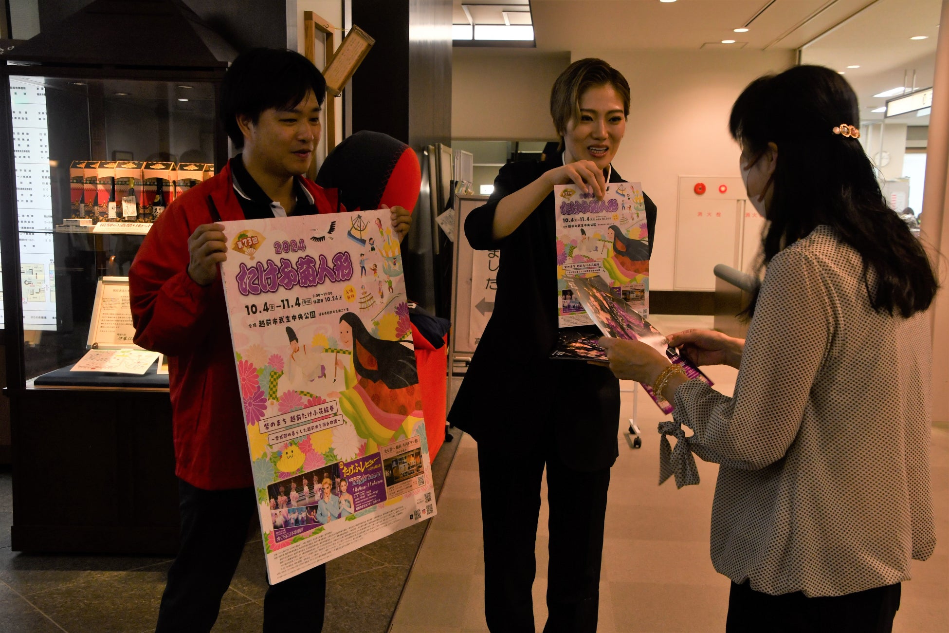 岐阜県高山市の友好都市である福井県越前市から、「たけふ菊人形」宣伝隊が高山市役所を訪問し、10月4日(金)から開催される「第73回2024たけふ菊人形」のPRを行いました。宣伝隊は市役所ロビーで市民に向けたPRを行った後、高山市上田和史副市長や高山市議会を訪問しました。