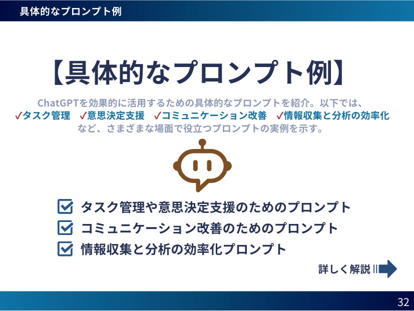 ChatGPTは、経営者にとって強力な支援ツールとなり得る対話型AIです。最新の言語モデル技術に基づき、経営に関連する複雑な情報を迅速かつ正確に処理します。これにより、経営者はより迅速かつ効果的に意思決定ができ、組織全体のパフォーマンス向上に役立つようになります。本レポートでは、経営者が直面する課題に対してChatGPTをどのように活用できるか、そのプロンプトの使い方と成功事例を詳しく解説しています。