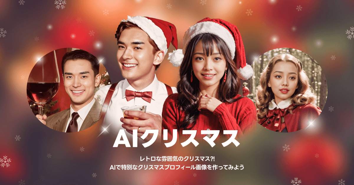「AIクリスマス」は、自分の顔写真8〜12枚を登録すると、これからの時期にぴったりなクリスマス感あふれるレトロなビジュアルイメージをAIが30枚生成するコンテンツです。ぜひ自分だけの特別な画像を生成し、クリスマスや年末年始ムードを盛り上げてください。