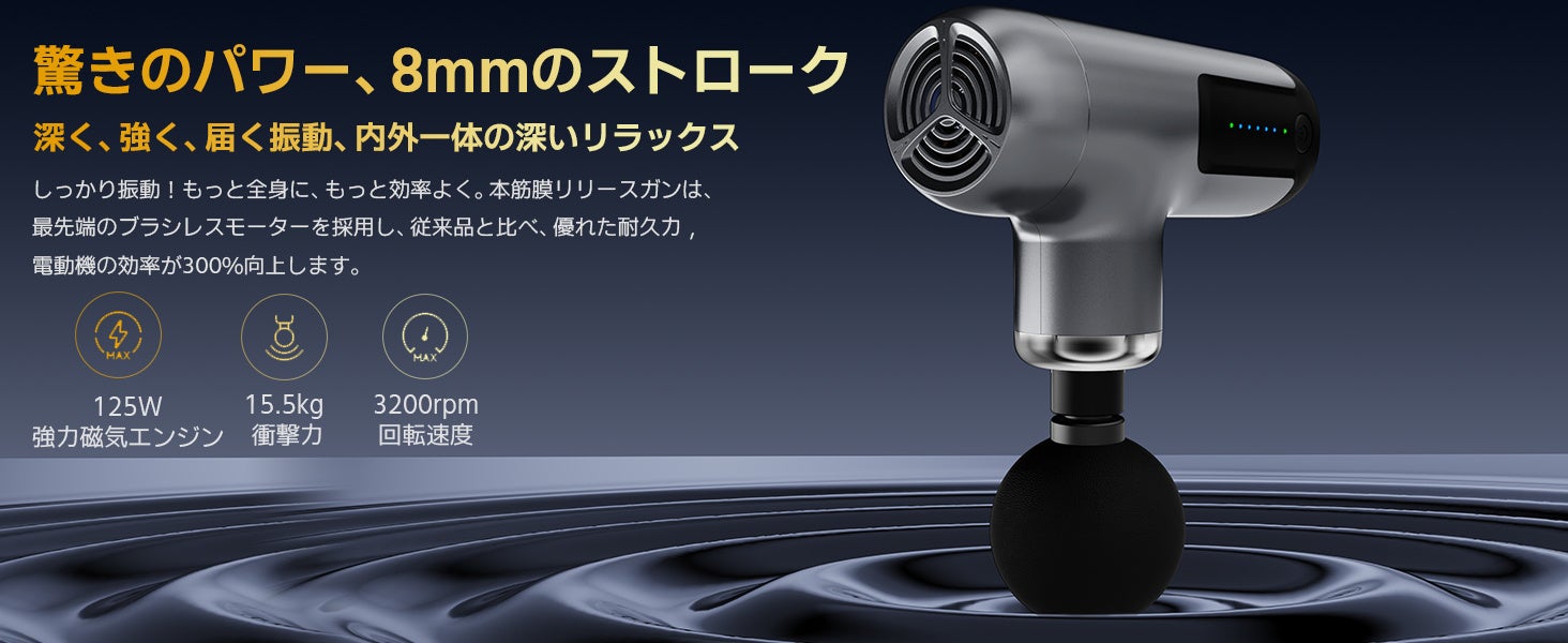 「Lihilis筋膜リリースガン」は、最先端のブラシレスモーターを採用し、効率が従来比で300%向上。双ベアリング構造により、安定した振動が深部まで伝わり、体に優しい設計です。340gの超軽量かつスマートフォンよりもコンパクトなデザインで、手軽に持ち運べ、どこでも使えます。