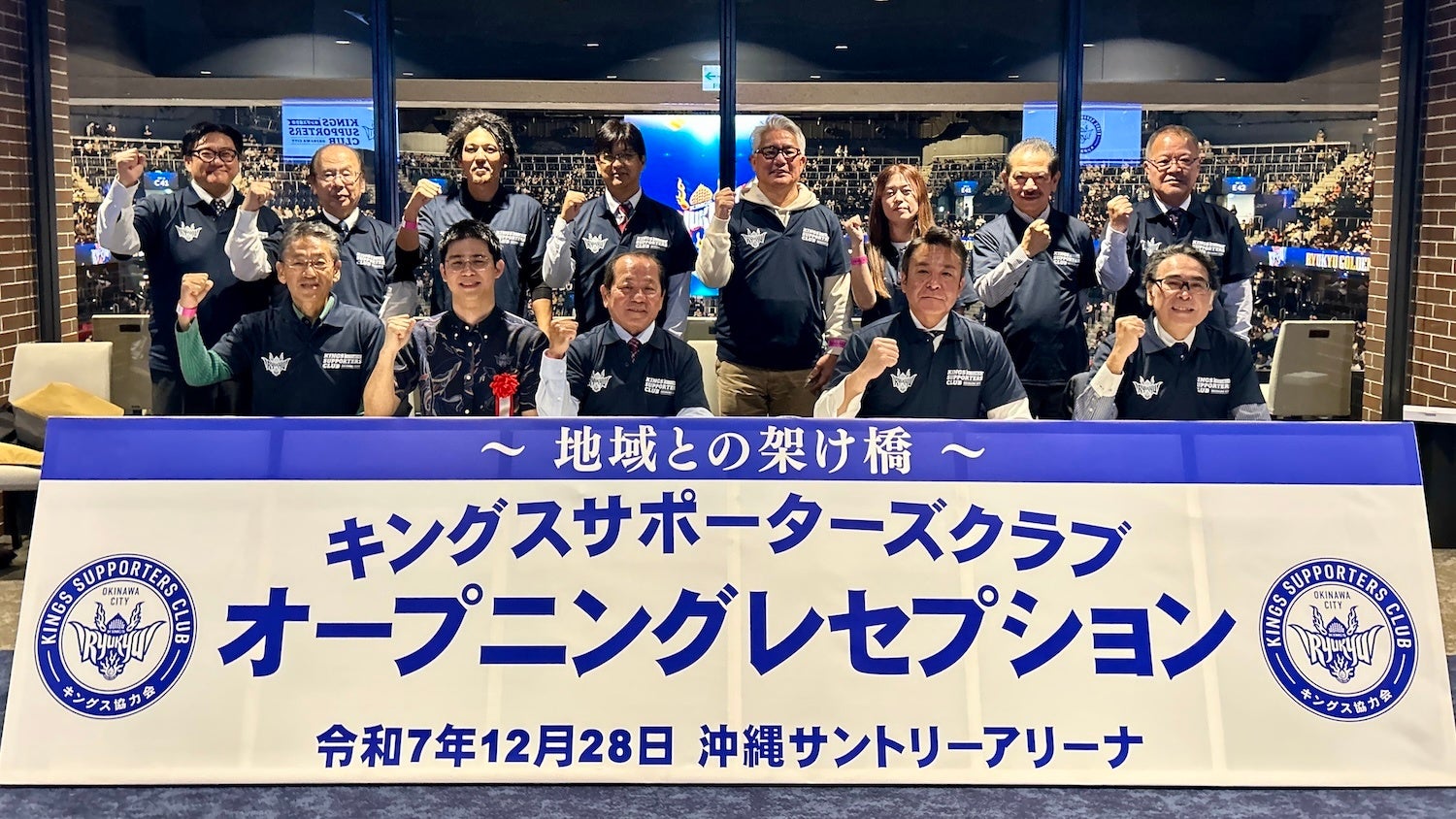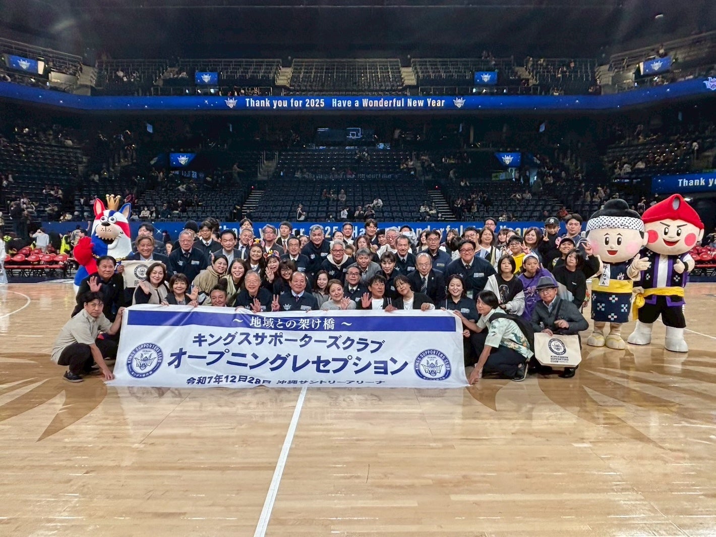 また、12月28日(日)に開催された仙台89ERS戦の試合前には、キングスサポーターズクラブのオープニングレセプションが実施されました。当日は、キングスサポーターズクラブ会長・宮里敏行氏をはじめ、花城大輔沖縄市長、瑞慶山良一郎沖縄市議会議長、沖縄バスケットボール株式会社 代表取締役社長 仲間陸人氏らが出席され、官民一体となってキングスを支える体制づくりを内外に発信する機会となりました。