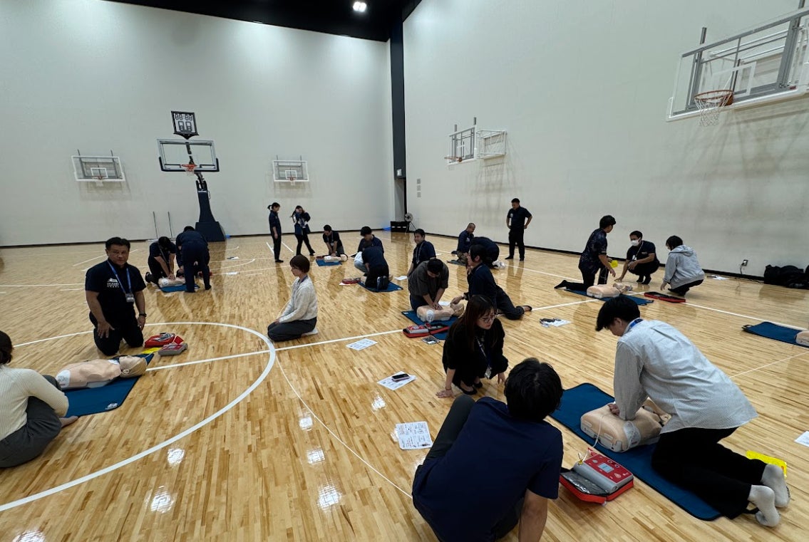 沖縄アリーナ社では、万が一の事態に備え、職員一人ひとりが救急車到着までの間に適切な初期対応を行える体制づくりを目的として、応急手当講習会を受講しました。