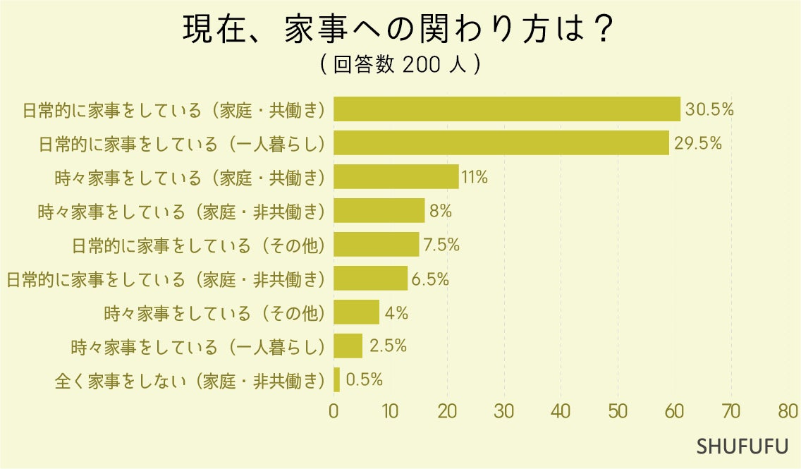 現在、家事への関わり方は?の問いに対して最も多かったのが「日常的に家事をしている(家庭・共働き)(30.5%)」でした。 次いで「日常的に家事をしている(一人暮らし)(29.5%)」「時々家事をしている(家庭・共働き)(11%)」という結果でした。共働き家庭では奥さんと家事分担を決めていたり、一人暮らしの方は自分でやらないといけないので必然的に日常的な家事への関わりがある方が多いのかと思われます。