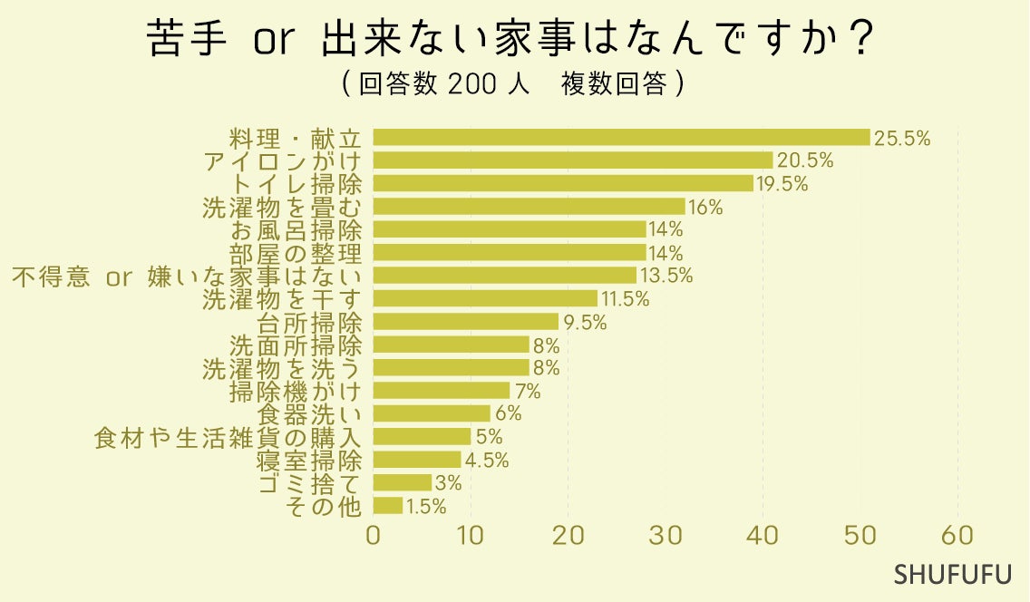 苦手 or 出来ない家事を尋ねたところ、1位は「料理・献立(25.5%)」、2位「アイロンがけ(20.5%)」となりました。「得意 or 好きな家事」でも1位だった「料理・献立」が1位なのは面白いですね。人によって得意な方と苦手な方で両極端に分かれるのかもしれません。