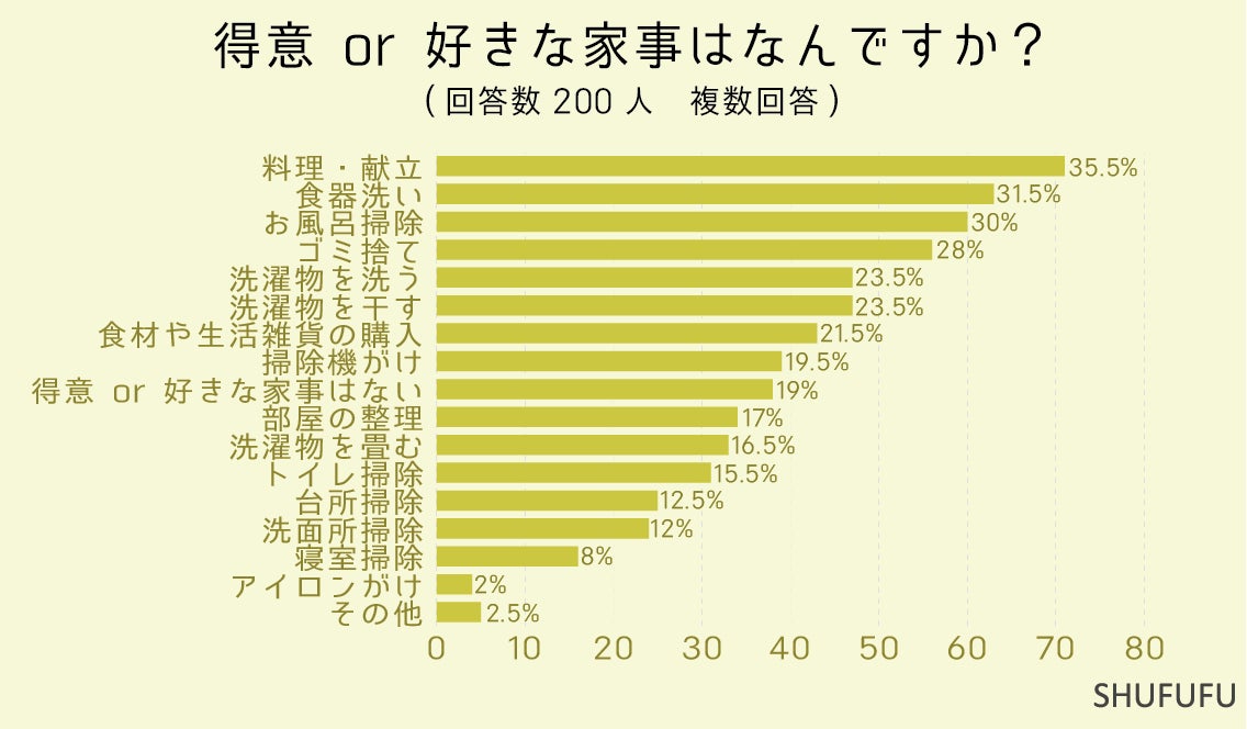 得意 or 好きな家事に関しては、「料理・献立」が1位でした。自分で美味しいものを作れる料理は楽しいですよね。