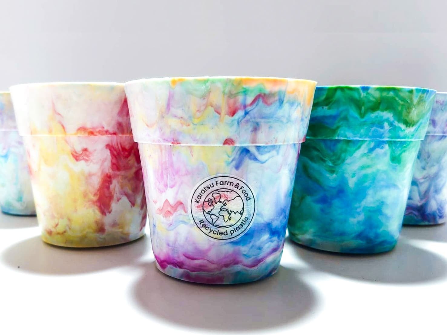 唐津の地域で回収されたペットボトルキャップを中心に、一部には唐津の海に流れ着いた海洋プラスチックも活用。一つひとつ手作業で成形されるポットは、すべて色・模様が異なる一点ものです。