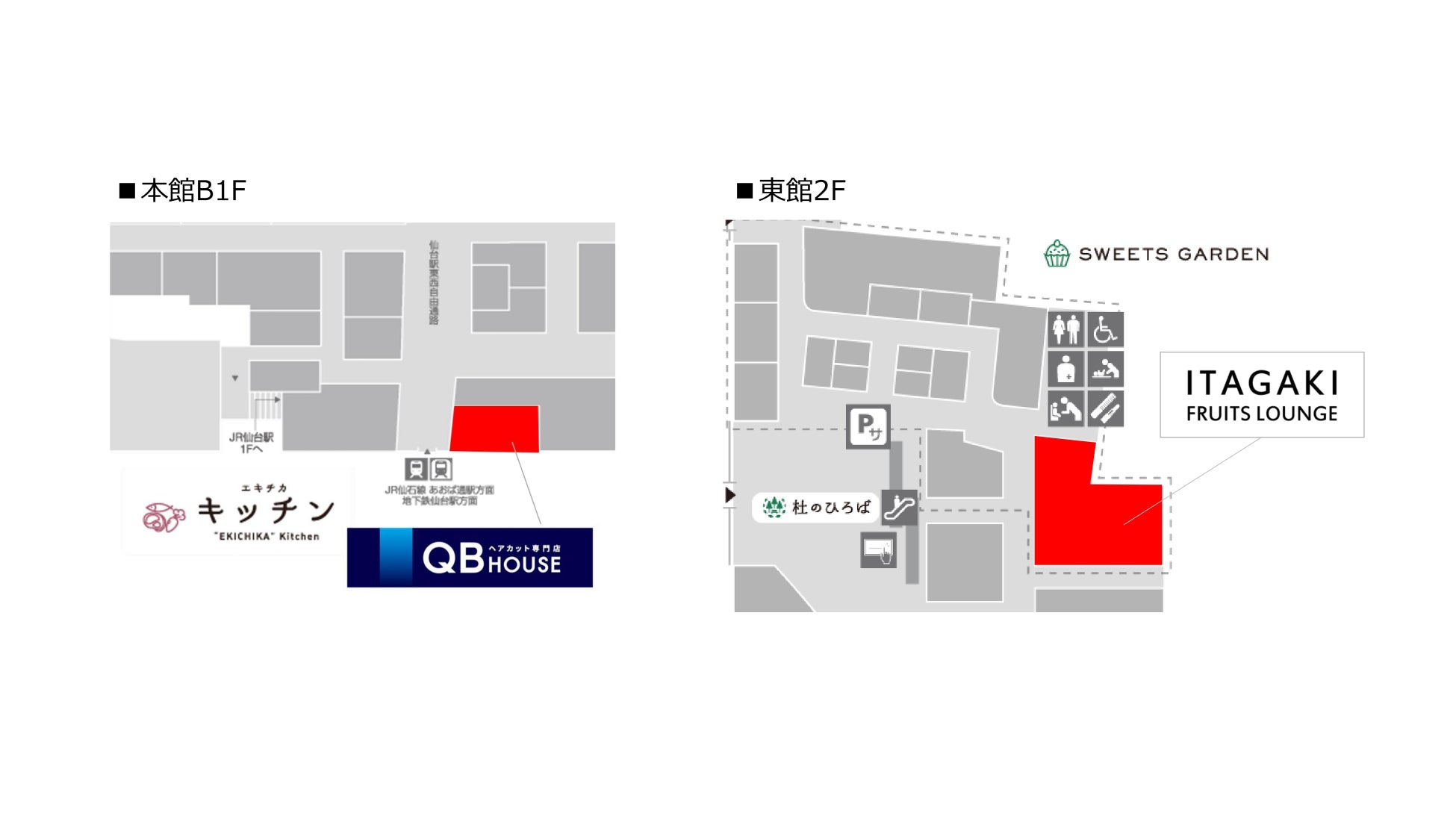仙台ターミナルビル株式会社(本社 仙台市、代表取締役社長:松崎 哲士郎)が運営するエスパル仙台(所在地:仙台市青葉区中央1-1-1) 東館2Fスイーツガーデンに、株式会社いたがき(本社:仙台市宮城野区、代表取締役社長:板垣 金太郎)が運営する「ITAGAKI FRUITS LOUNGE」が11月27日(木)に、本館B1Fにキュービーネット株式会社(本社:東京都渋谷区、代表取締役社長:北野 泰男)が運営する「QBハウス」が11月28日(金)に新規オープンいたします。