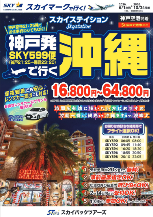 スカイパックツアーズ株式会社(本社:東京都中央区、社長:横山正巳)は、スカイマークを利用した価格固定型のパンフレット旅行商品「神戸発SKY599便で行く沖縄」【神戸空港発着】(2026年6月1日出発~2026年10月24日帰着)の販売を開始しました。スカイマークだけを取り扱う専売店だからできるスペシャルプライス!早めのご予約がお得です。