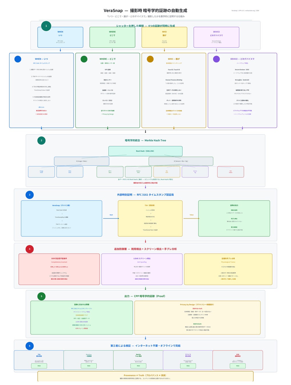 VeraSnapは、Content Provenance Protocol(CPP)v1.5に準拠し、Apple Secure Enclaveによるハードウェア署名、RFC 3161タイムスタンプ、生体認証バインディング、XOR完全性不変量による削除検出を組み合わせた、消費者向けとしては世界初※1の包括的デジタル証拠プラットフォームです。