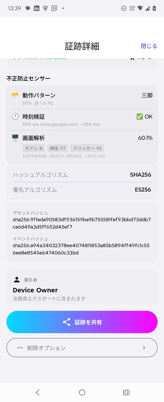※1 「世界初」は、消費者向けスマートフォンアプリにおいて、気圧センサー環境証跡・IMU振戦パターン解析・NTP時刻整合性検証・ソフトウェアベースマルチモーダル画面再撮影検出(モアレ+フリッカー+輝度分布の3モーダル融合)を、RFC 3161暗号学的タイムスタンプおよびオープン標準プロトコル(CPP)と統合した製品として。2026年2月11日時点、当社調べ。