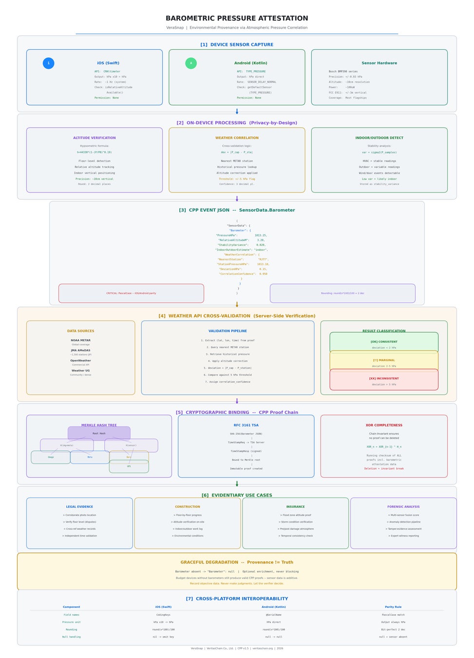 iPhone 6以降に搭載されるBosch BMP390系気圧センサー(精度:±0.03 hPa、高度分解能:約10cm)を活用し、撮影時の環境情報を暗号学的証跡に記録します。