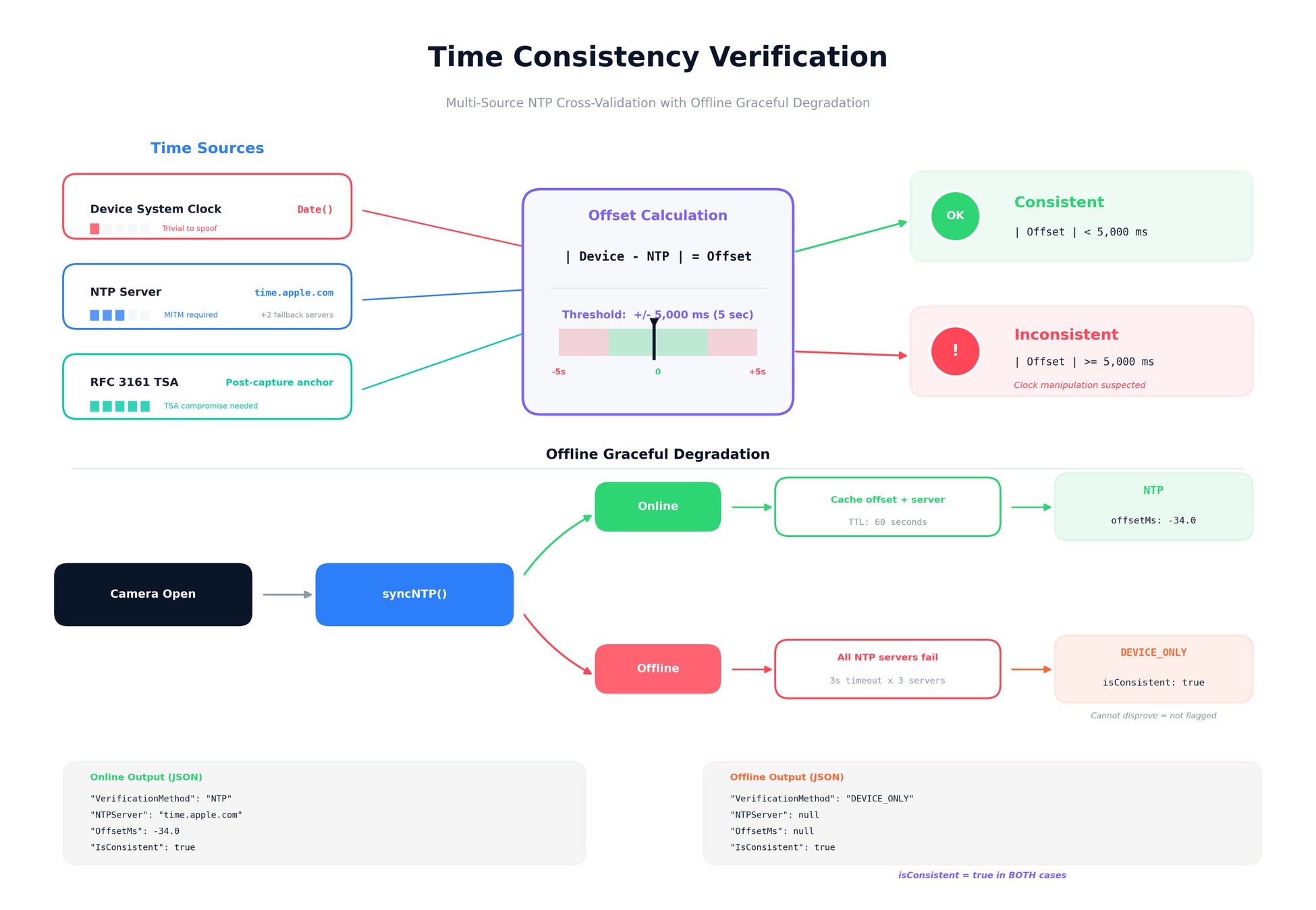 VeraSnap v1.5は、撮影時にデバイス時計とNTPサーバー時刻を同時に取得し、両者の差分(オフセット)を検証します。