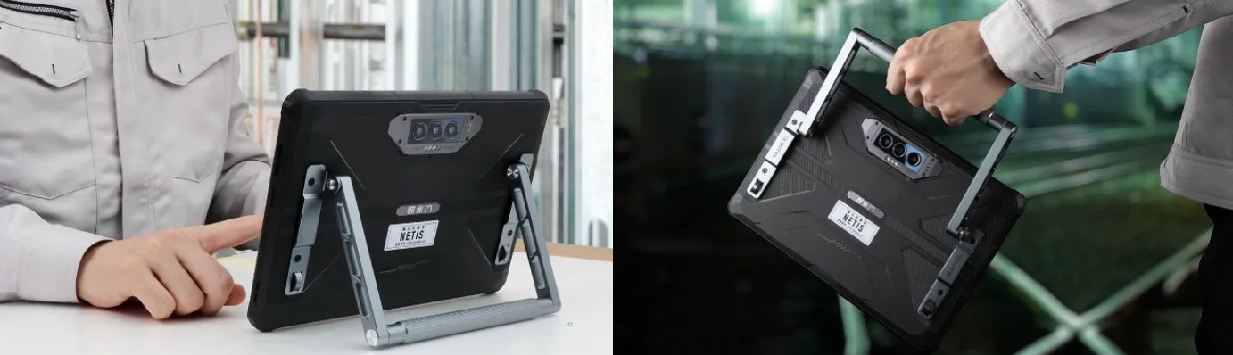 更に標準で、スタンドまたは持ち手として活用できる2wayの専用パーツは、持ち運びに便利なだけでなく、自立するので現場で図面を表示して確認しながら作業ができます。