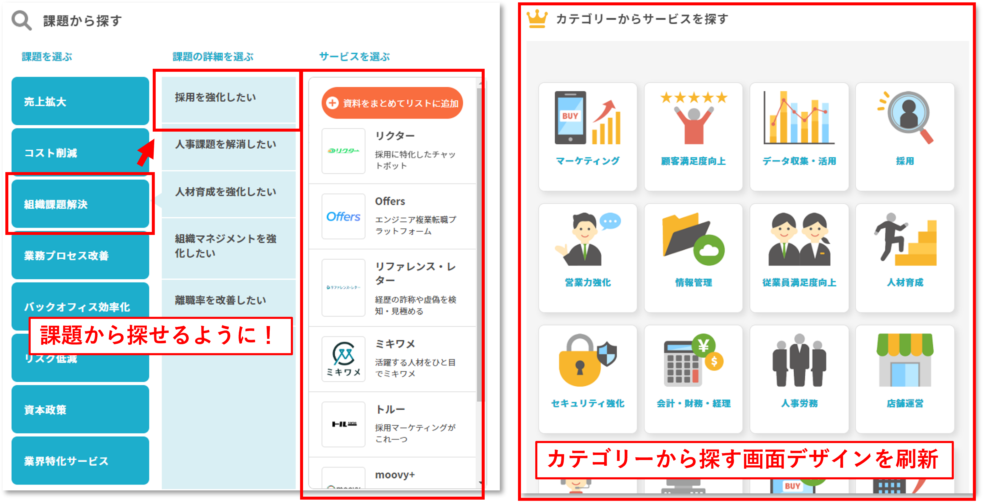 これまでは、サイトにご訪問いただいた後サービスを探す為には、「サービスを探す」からと「カテゴリーランキング」からの2つの方法のみでした。そこで、より高い利便性を実現させるために「課題から探す」を追加いたしました。