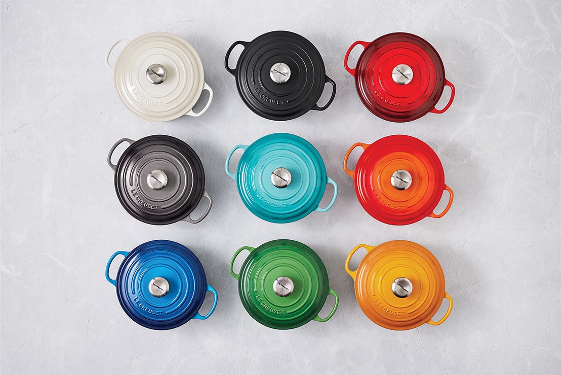 ル・クルーゼは創業と同時に、鋳型の中で溶ける鉄をイメージしたオレンジ色の鍋をデビューさせ、キッチンにあざやかな色彩を持ち込みました。現在は定番色に加えてシーズナルカラーや限定色をそろえ、調理器具の中で最も幅広いカラーバリエーションを持っています。同じ色の鍋でも一つひとつ違った表情があるのは、すべて職人の手仕事で作られているか。その個性はまるでアートのようです。どのカラーの、どの個性をあなたの家やお店に連れて帰るかを考えるのは、ル・クルーゼを選ぶ喜びの一つでしょう。フランスならではのエレガントな色彩は、基本的な形が100年前から変わっていないのにモダンなキッチンやダイニングにもよく似合う理由です。ル・クルーゼは蓄熱性が優れているので器としてそのまま食卓に出すこともでき、ダイニングテーブルをスタイリッシュに彩ります。キッチンに置くと、インテリアのアイテムとしても映えるだけでなく、もっと料理をしたい気持ちになるので不思議です。