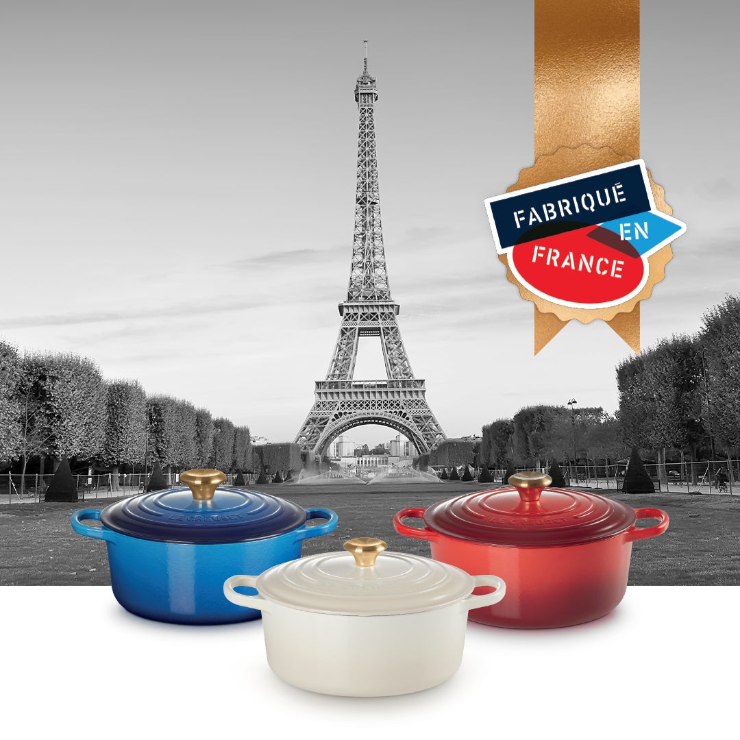 フランスの大統領官邸であるエリゼ宮で行われた、La Grande Exposition du Fabriqué en France(フランス製品の大展示会)の展示品に選ばれたのです。マクロン・フランス大統領の主導で開催されたこの展示会は、フランスで作られている工業製品や様々な職人技にスポットライトを当て、フランスの豊かさとフランスの企業、職人、技術者、農業者が持つノウハウを広めていくことを目的にしています。選考の過程ではその品質や革新性だけでなく、環境への配慮や地域経済への貢献など社会的な側面も重視されます。応募は2,452点。その中から選ばれたことはとても名誉なことです。大統領に認められたMADE IN FRANCEとしての誇りを胸に、ル・クルーゼの鍋は来年誕生100年を迎えます。